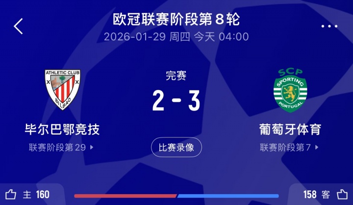 01月29日讯 欧冠联赛阶段末轮,葡萄牙体育客场3-2逆转战胜毕尔巴鄂,最终排名第七直通欧冠16强。
